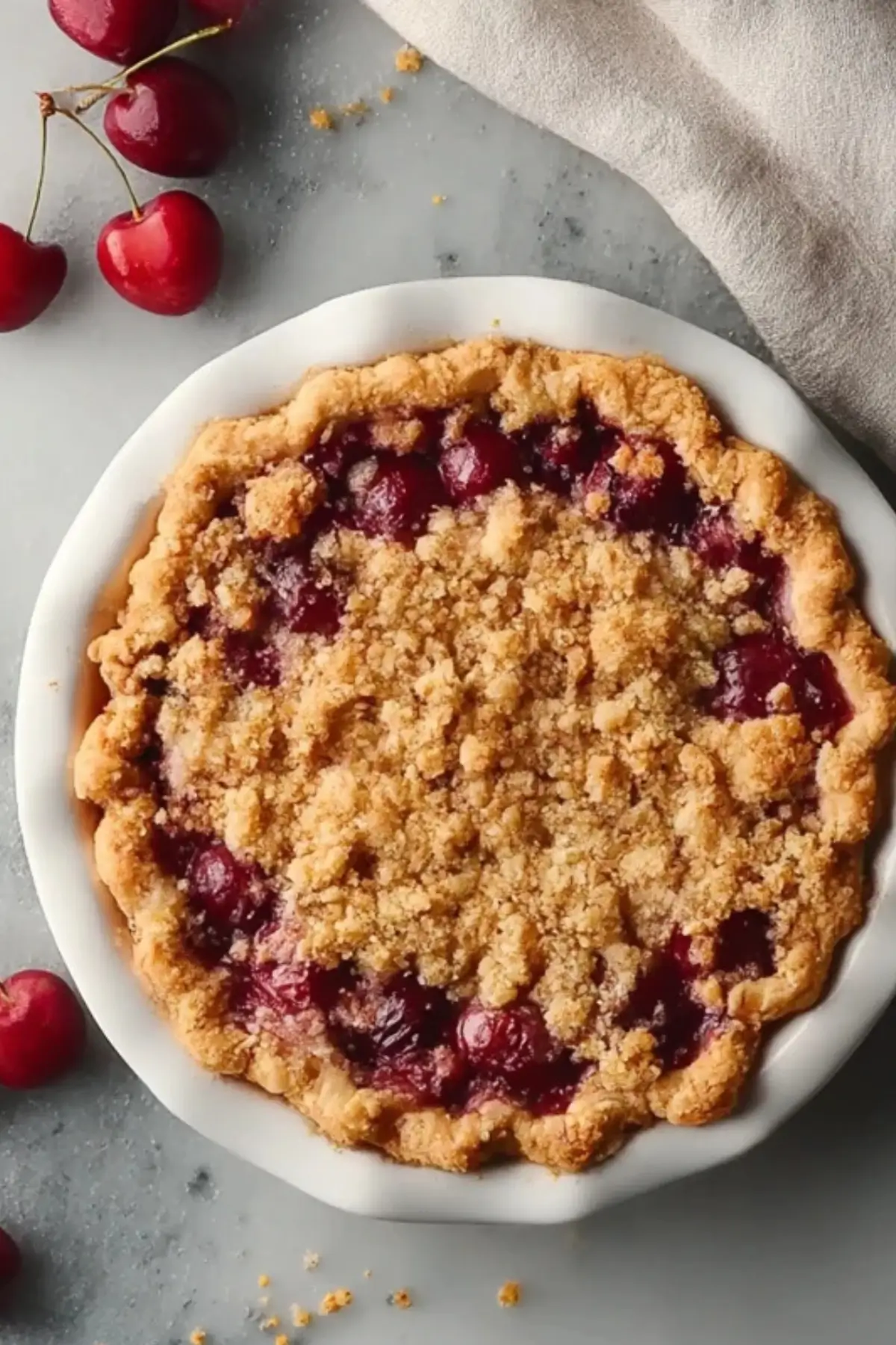 This cherry crumb pie is the perfect dessert for any occasion, combining the sweetness of ripe cherries with a buttery, crisp crumble topping. Whether youโre celebrating a summer gathering or enjoying a quiet afternoon at home, this pie is sure to be a hit. With its easy preparation, adaptable ingredients, and deliciously balanced flavors, itโs a must-try recipe that everyone will love. So, grab some cherries and get bakingโyour taste buds will thank you!