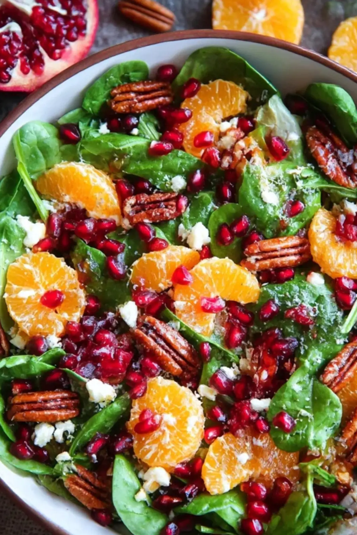 The combination of sweet, tart, and savory elements makes it a festive treat. With ingredients like spinach, pecans, mandarin oranges, pomegranate seeds, and goat cheese, this salad offers a mix of textures and flavors that are perfect for the holiday season.