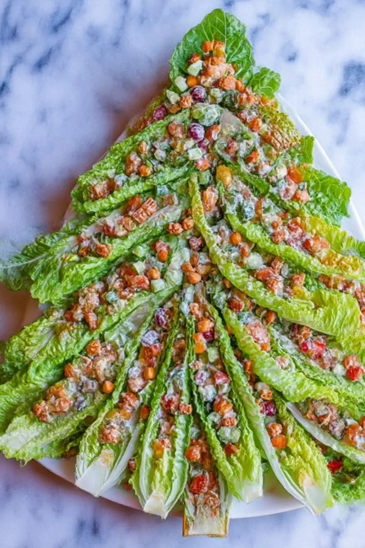 - Prepare the Lettuce: Start by washing and drying the romaine lettuce thoroughly. Cut the lettuce into bite-sized pieces, then arrange them in the shape of a Christmas tree on a large serving platter. This will be the base of your salad.