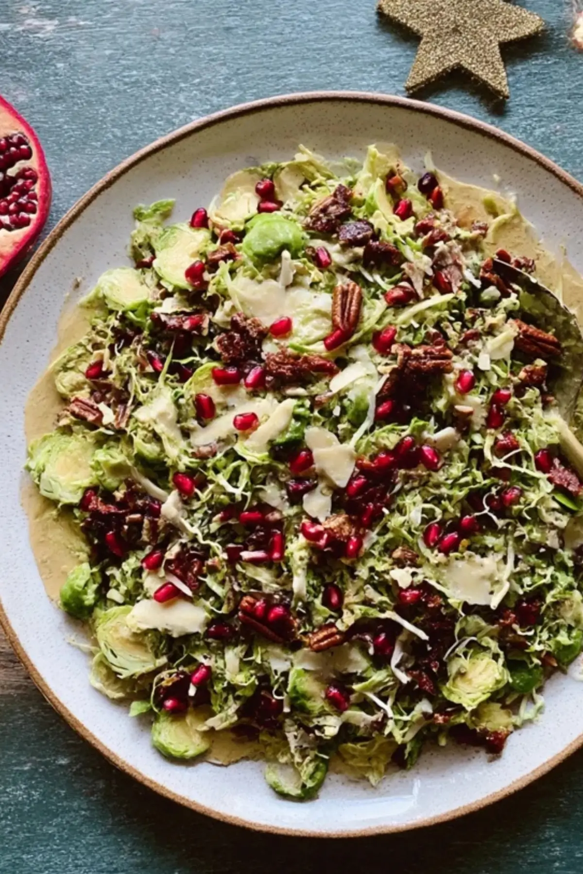- Assemble the Salad: In a large bowl, combine the shaved Brussels sprouts, pomegranate seeds, dried cranberries, and Parmesan cheese.