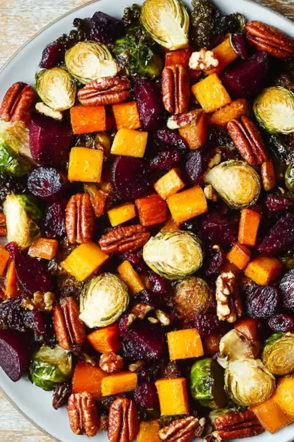 This salad is not only a visual feast but also provides numerous health benefits, especially during the winter months. Roasted vegetables like butternut squash and Brussels sprouts are high in fiber, which can aid in digestion and help you feel fuller longer. Beets, known for their detoxifying properties, can help support liver health and improve circulation. The addition of fresh herbs and healthy fats from olive oil further boosts the nutritional value, making this salad a perfect winter meal.